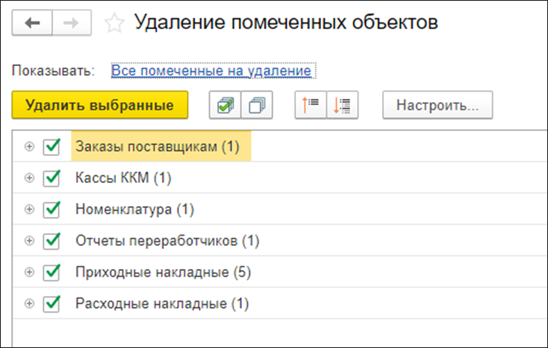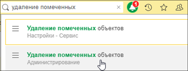 В строке поиска в верхнем меню введите «удаление помеченных объектов» и откройте данный раздел.